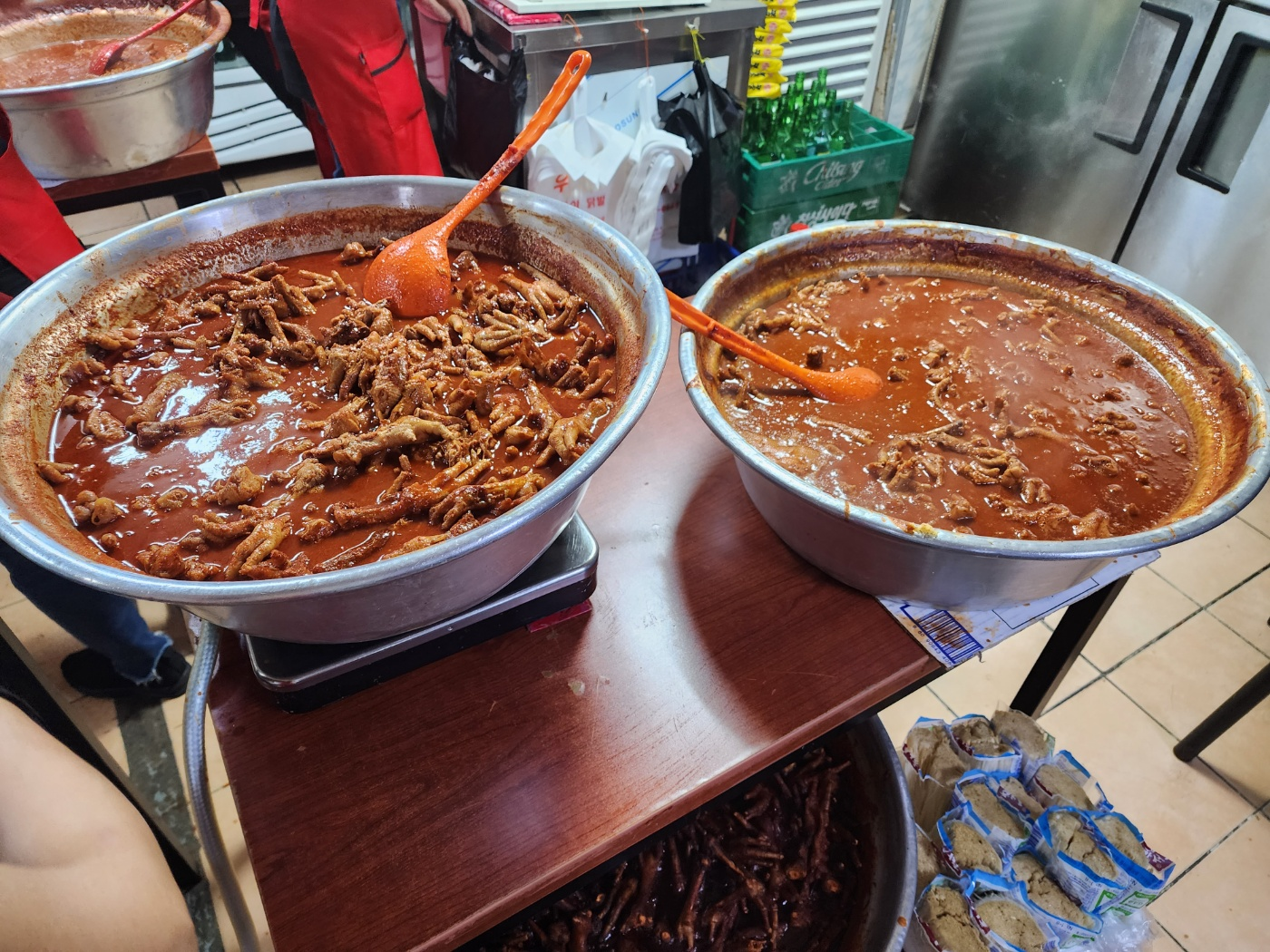 그러나 여기는 80% 이상의 고객들이 닭발을 시켜먹는 닭발 맛집입니다. 들어가면 이렇게 큰 대야에 닭발을 푹 끓이고 있는데, 이게 제대로입니다. 오래 익혀서 그런지 닭발이 아주 야들야들하고 먹기가 좋습니다. 국물도 일품이죠.