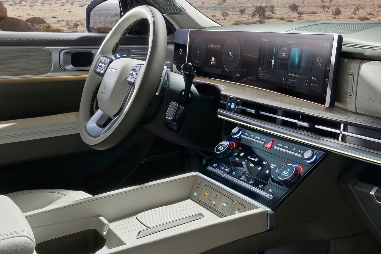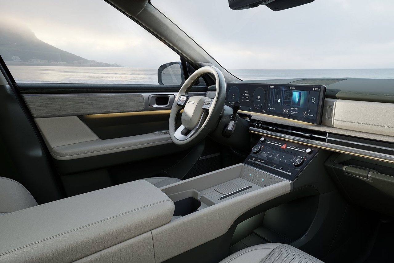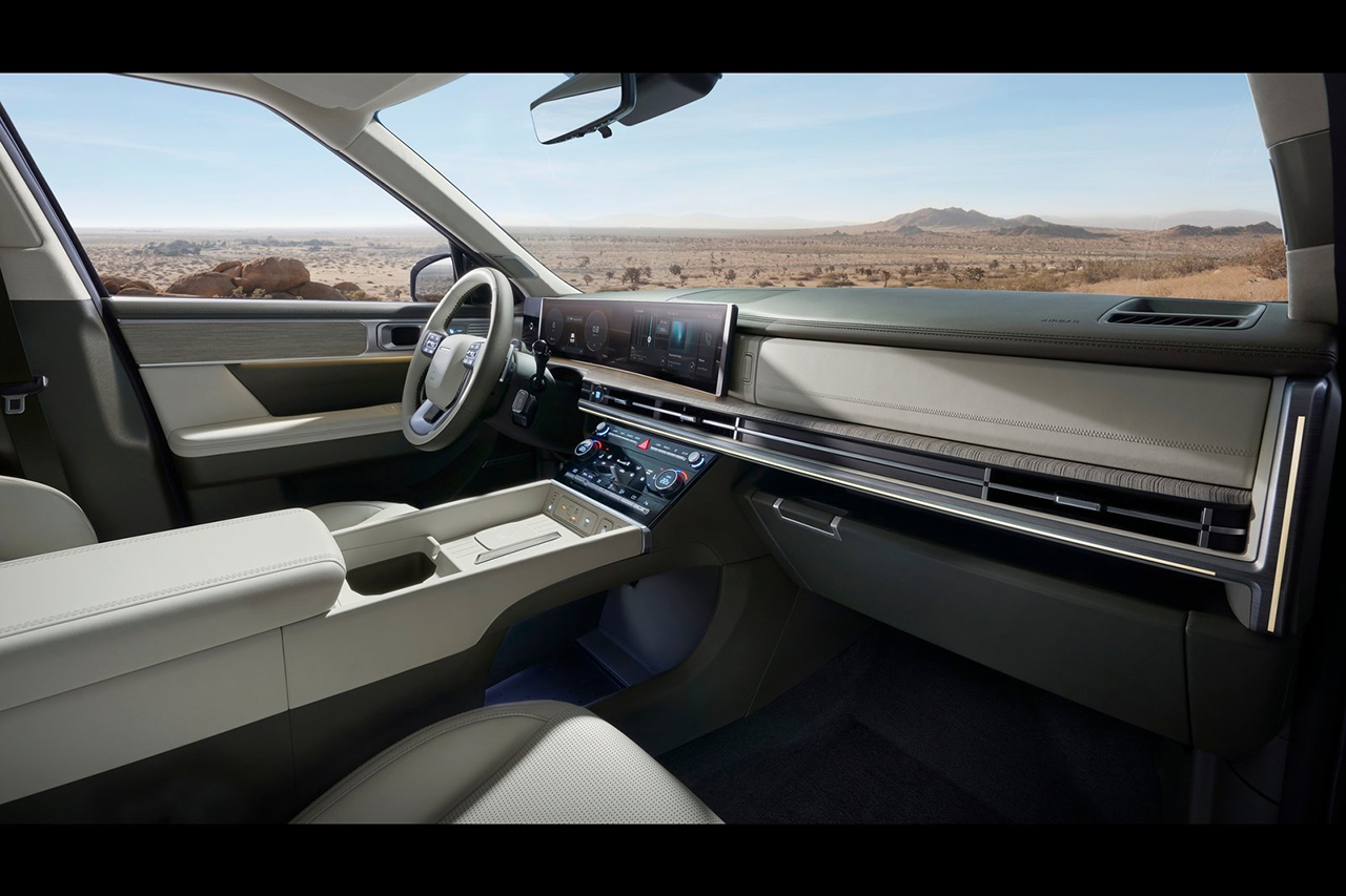 싼타페의 내부는 고급스러운 소재와 인체공학적인 설계로 구성되어 있습니다. 특히, 캘리그래피 모델은 나파가죽 시트와 스웨이드 내장재가 적용되어, 탑승객에게 최상의 편안함을 제공합니다. 12.3인치의 디지털 계기판과 터치스크린 내비게이션은 최신 기술이 반영된 편리한 주행 환경을 제공합니다.